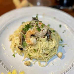 Spaghetti Aglio E Olio With Seafood and Portobello Mushrooms