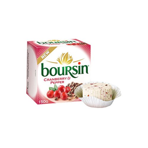 Boursin has an exceptional texture that is light and creamy. Its mild flavour is enhanced with a delicous blend of cranberry and cracked black pepper. The cranberries add a tangy and sweetness to the cheese while the pepper gives a subtle heat.