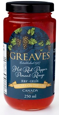 All of the Greaves wine jellies are made with wines from Niagara on the lake. They are a lovely addition to any charcuterie board or can be paired with different cooked meats. The red hot chili jelly is made with peppers and also pairs nicely with Asian rolls.