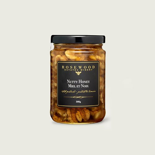 Fresh walnuts and Rosewood’s 100% Unpasteurized Wildflower are combined to create a unique tasting experience. It’s delicious on its own, or used to top your favourite cheese (brie and blue cheese are fan favourites), salad, yogurt, or dessert. For best results store in a dark dry place, such as a pantry or kitchen cabinet. Never refrigerate as it will speed up the crystallization process of the unpasteurized honey. Honey will crystallize naturally over time. To re-liquify, place the jar in a pot of water on low heat and wait until it returns to a liquid state. Do not microwave the jar. If you are in a hurry, remove a small amount of the crystallized honey and warm in a low power setting in a microwave safe container.